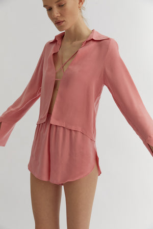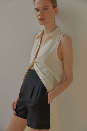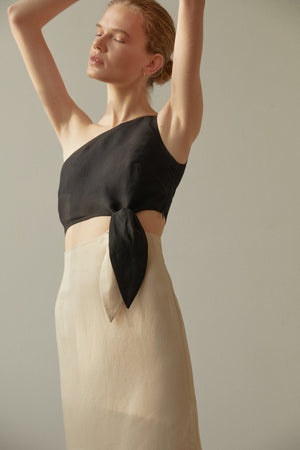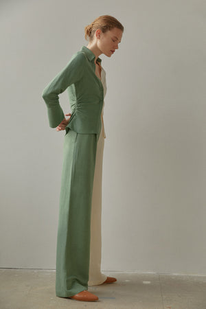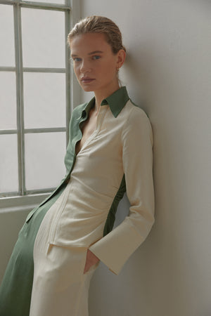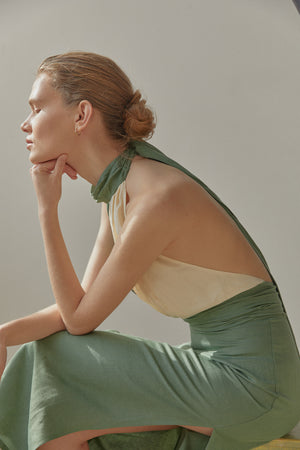 SS 22 collection is inspired by a journey to Puglia through the end of a 1960’s summer and the movie 'I AM LOVE'. Taking some of its colors by the region’s olive trees which are complemented with ivory architecture of the city of Ostuni. A-line silhouettes and color blocks comes in a modern and effortless look. Continuous lines appears on the cuffs, pockets or neck lines. Mother of pearl and black separately questions the identity of the character Emma Recchi when she is in light, a continual privileged life and when she is in dark, in love and discovering her own needs as a human being. Refined oversized shirts and dresses turn into more feminen draped silhouettes in the evenings.