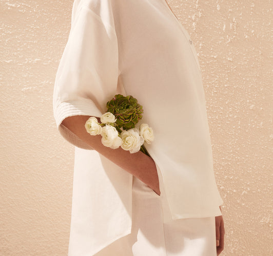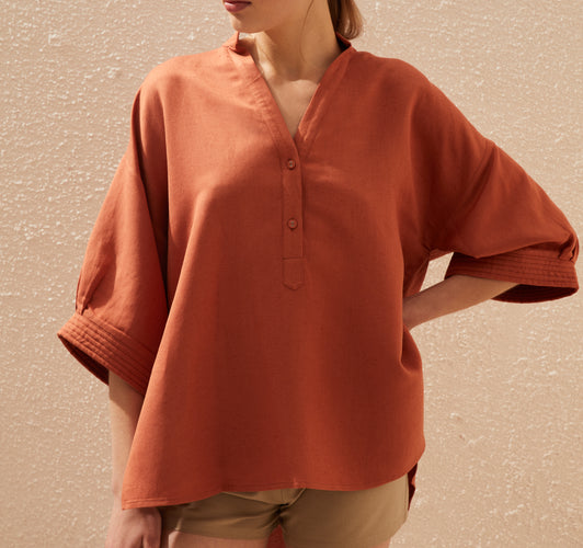 The Terra Top has a fluted mandarin collar with a nice V neck that is nicely closed with fabric covered buttons. Crafted for an oversized fit, this wide sleeve top is ideal for travel or for effortless long days. The slightly balloon sleeves have cuffs with fluting details. Finishes nicely with deep slits on the sides. Perfect to style with everyday pants for an effortless look!